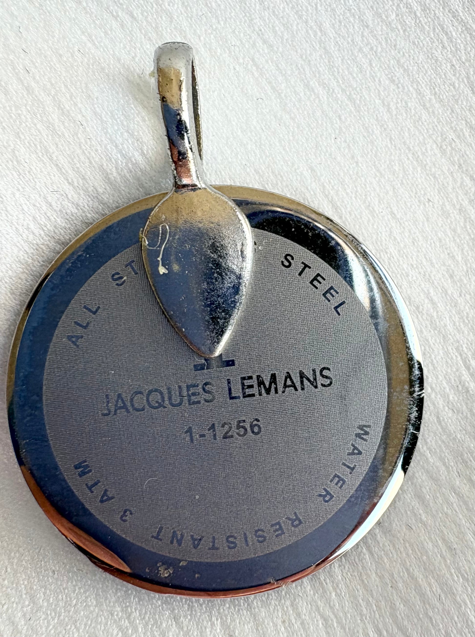 Struttura in metallo argentato ricavata dal fondello di un orologio vintage, che conferisce resistenza e un look sofisticato.