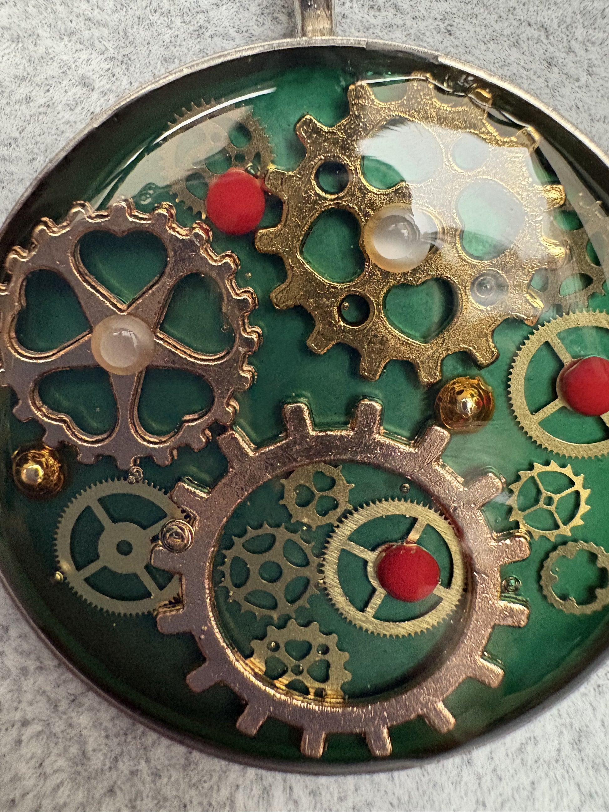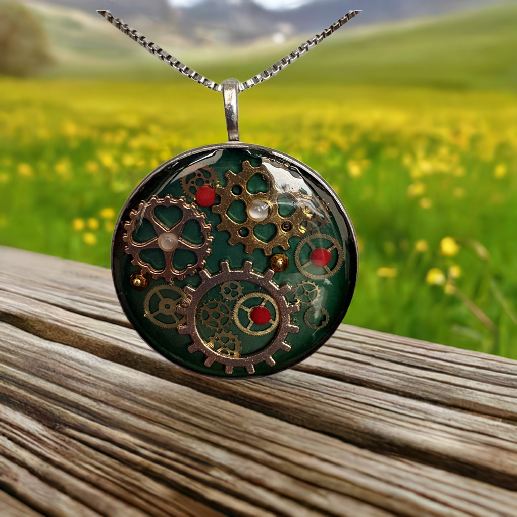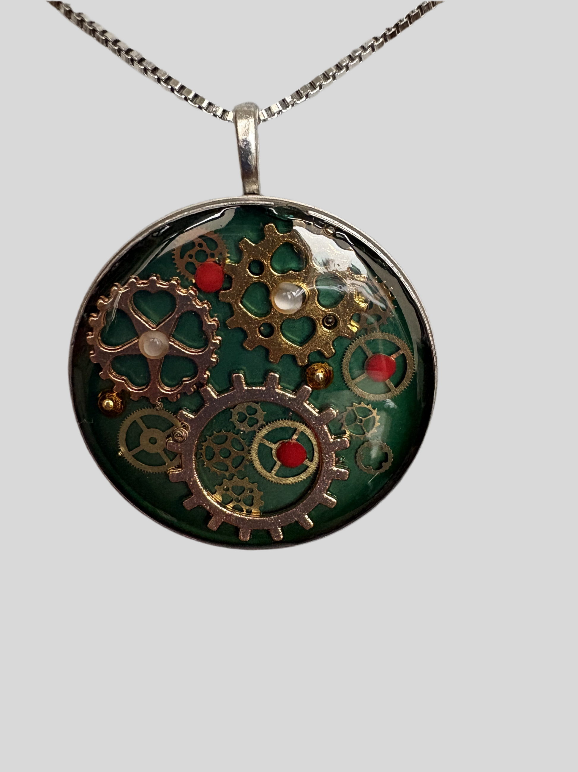 Un gioiello dal fascino industriale e raffinato, che fonde la precisione dell'orologeria con un design artistico unico. Questo ciondolo circolare presenta una base verde profonda, su cui sono incastonati ingranaggi metallici dorati e dettagli in resina, creando un effetto tridimensionale affascinante.