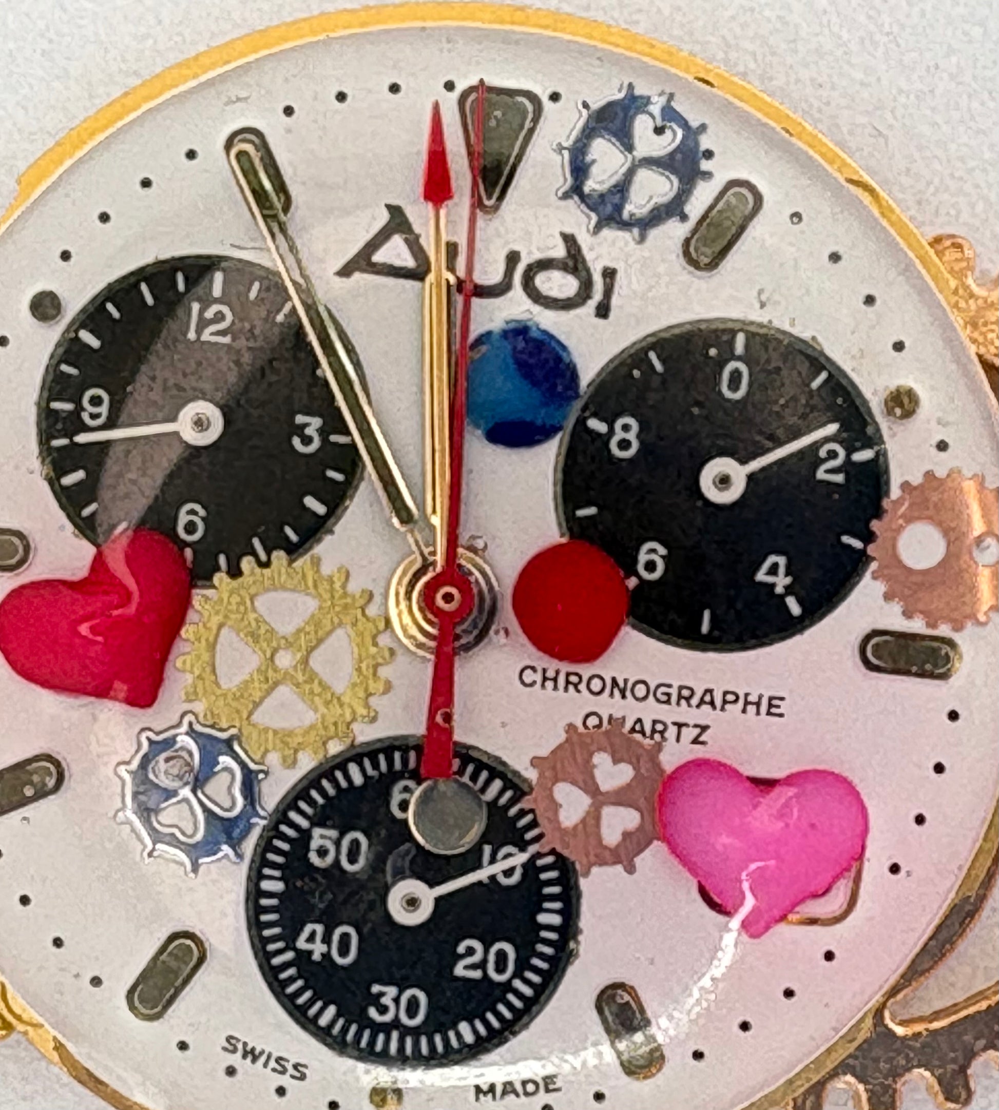 Un gioiello che mescola passato e vivacità, perfetto per chi cerca un accessorio che racconta una storia unica. Questa collana è realizzata utilizzando il quadrante di un crono vintage Audi , arricchito da dettagli colorati e pendenti originali che aggiungono un tocco di carattere.