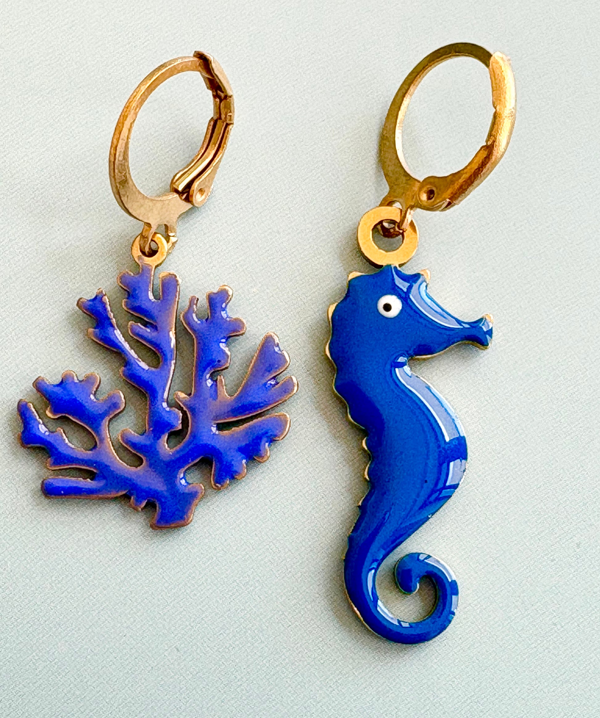 Un cavalluccio marino e un ramo di corallo, entrambi smaltati in una profonda sfumatura blu cobalto: questi orecchini asimmetrici raccontano una storia di mare, mistero e meraviglia.