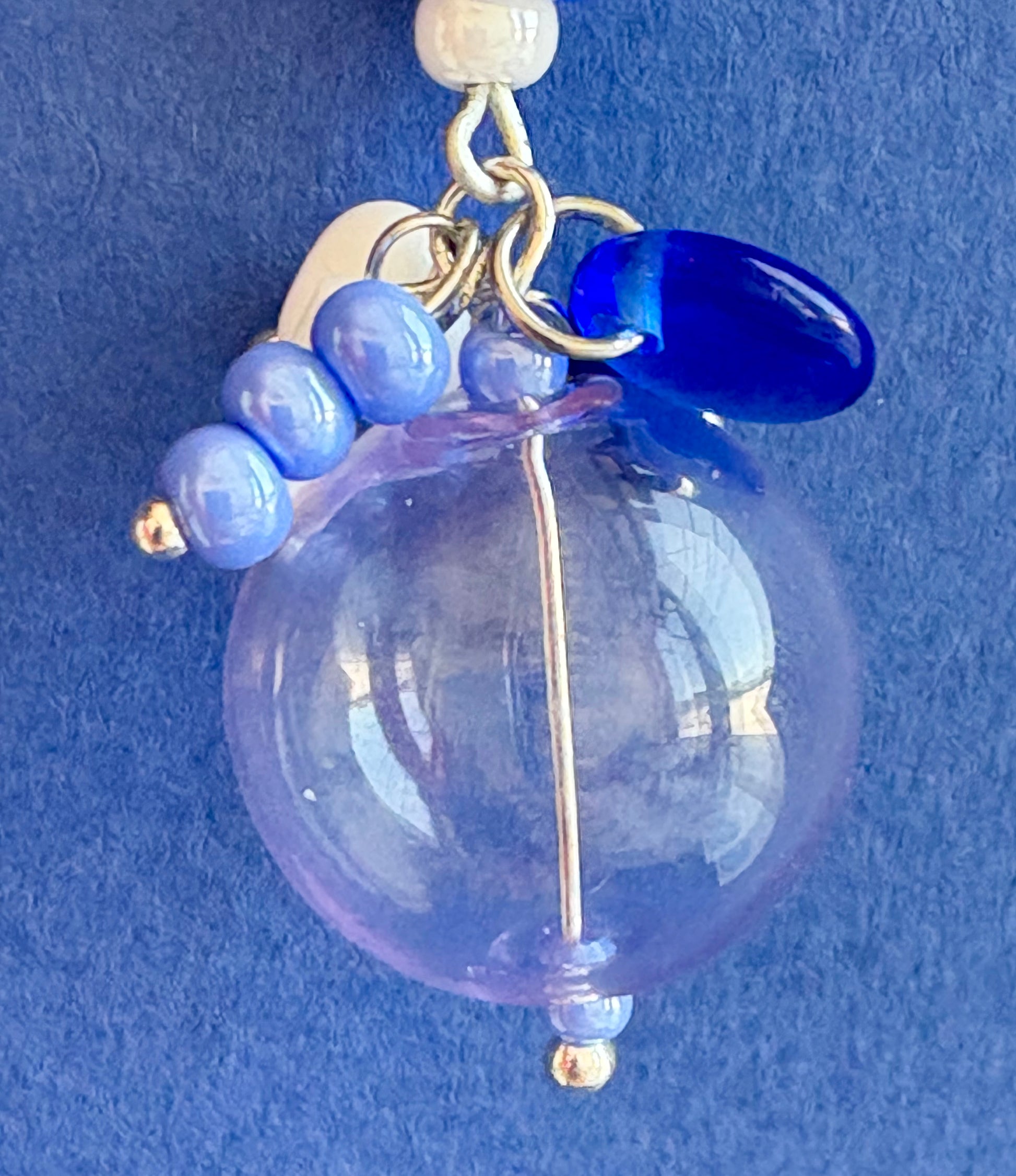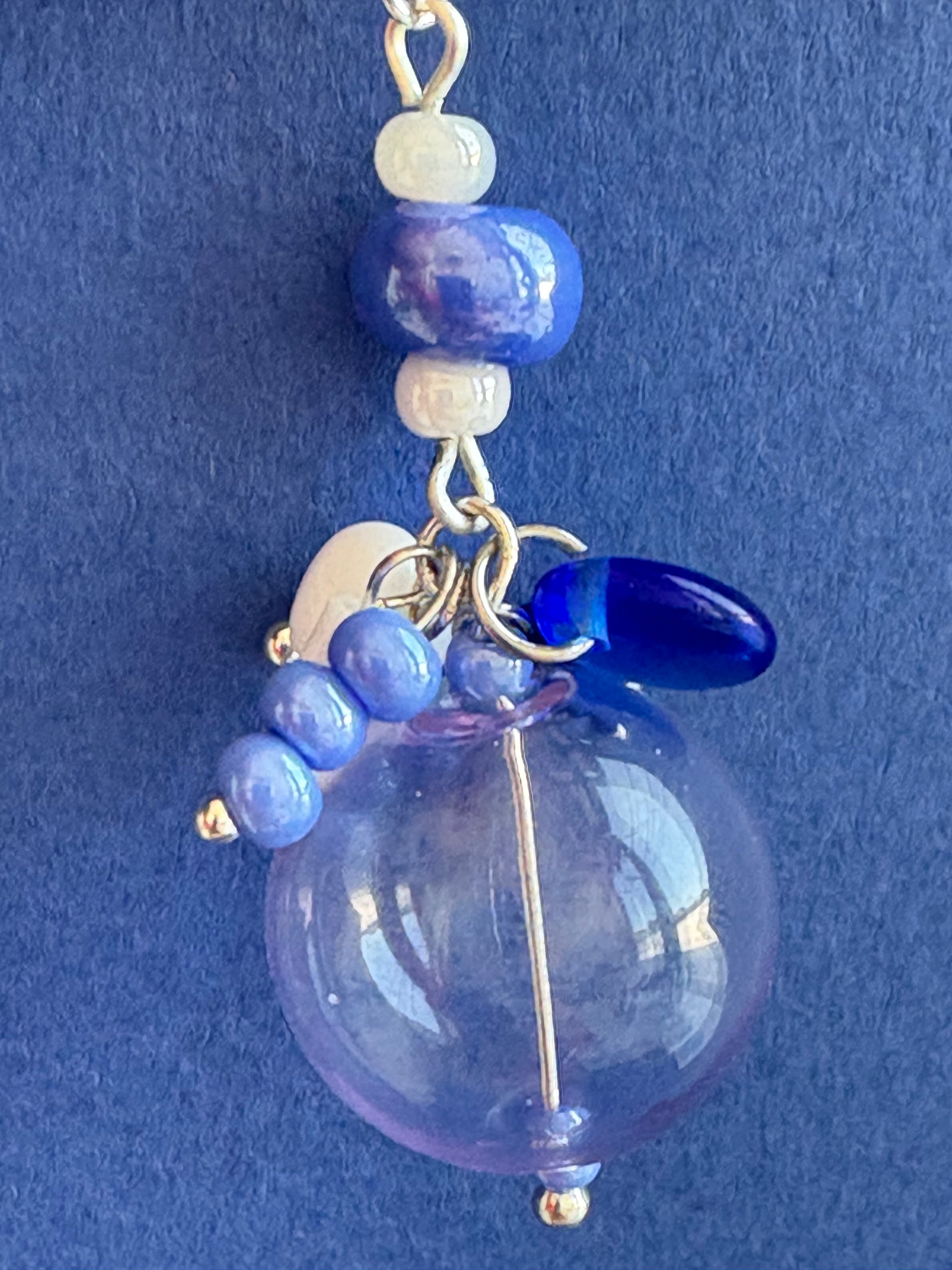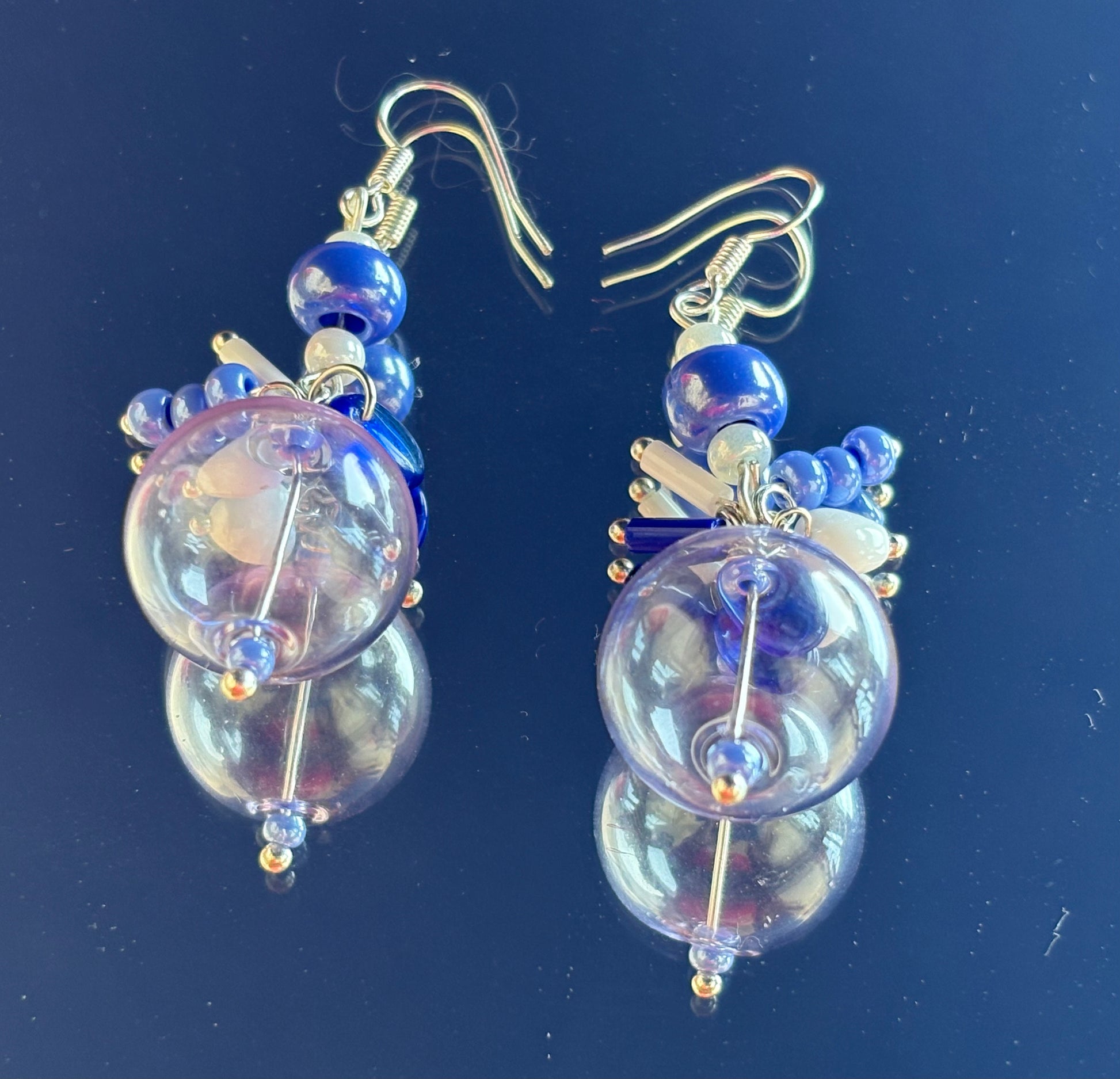 Un’eleganza sospesa tra luce e colore, questi orecchini evocano la delicatezza di un sogno sussurrato all’alba. Al centro, una sfera in vetro lilla trasparente riflette ogni raggio con grazia eterea, accarezzata da piccole perle blu cobalto, lavanda e bianco latte, come gocce di rugiada raccolte all’improvviso.